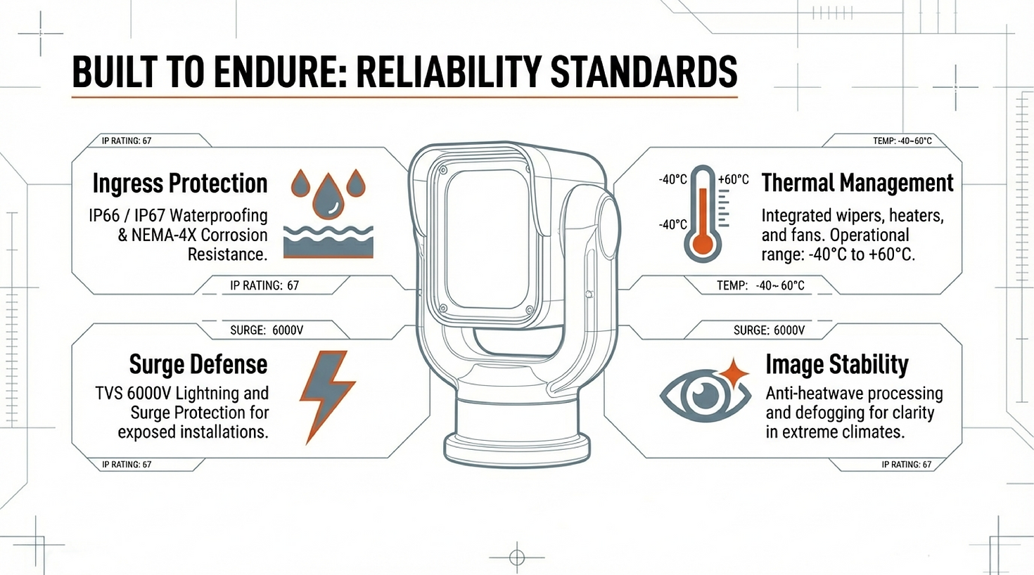 · IP67 Waterproof, Wiper (Optional) · PoE++ / Active IR LED